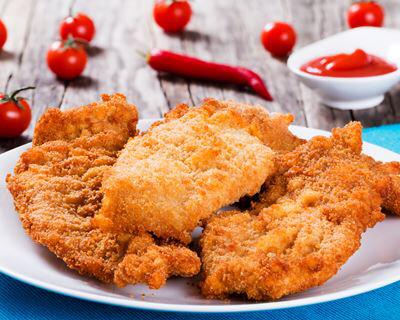 اقلي شرائح الدجاج في الزيت الساخن حتى تصبح ذهبية اللون (حوالي 3 دقائق لكل جانب).