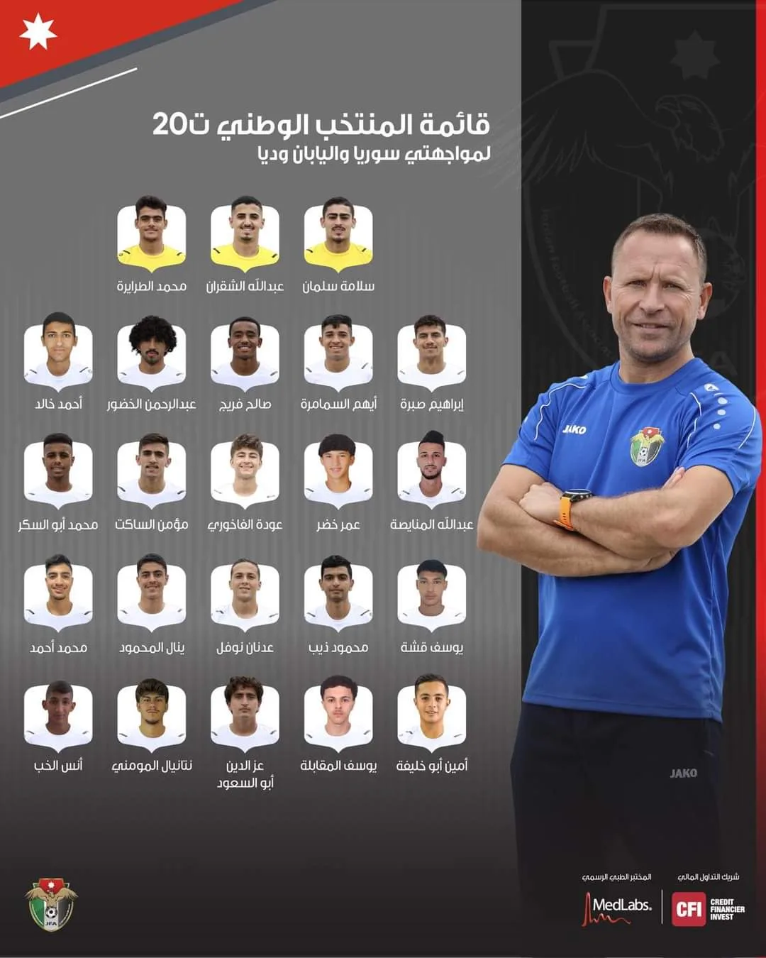 وضمت القائمة 23 لاعباً التي تستعد لخوض ثلاث لقاءات ودية: سلامة سلمان، عبدالله الشقران، محمد الطرايرة، إبراهيم صبرة، أيهم السمامرة، صالح فريج، عبد الرحمن الخضور، أحمد خالد، عبدالله المنايصة، عمر خضر.