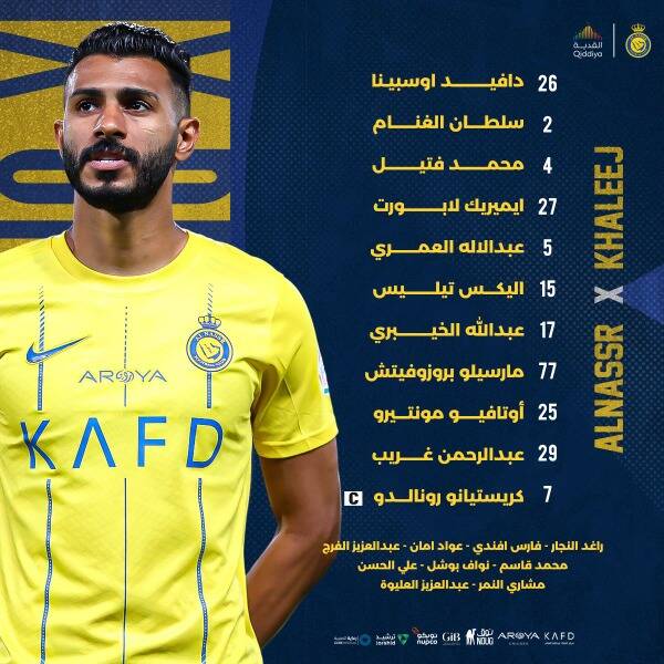 أعلن النصر السعودي تشكيلته الأساسية التي ستواجه الخليج، مساء اليوم السبت، ضمن الجولة 29 من دوري روشن السعودي للمحترفين.