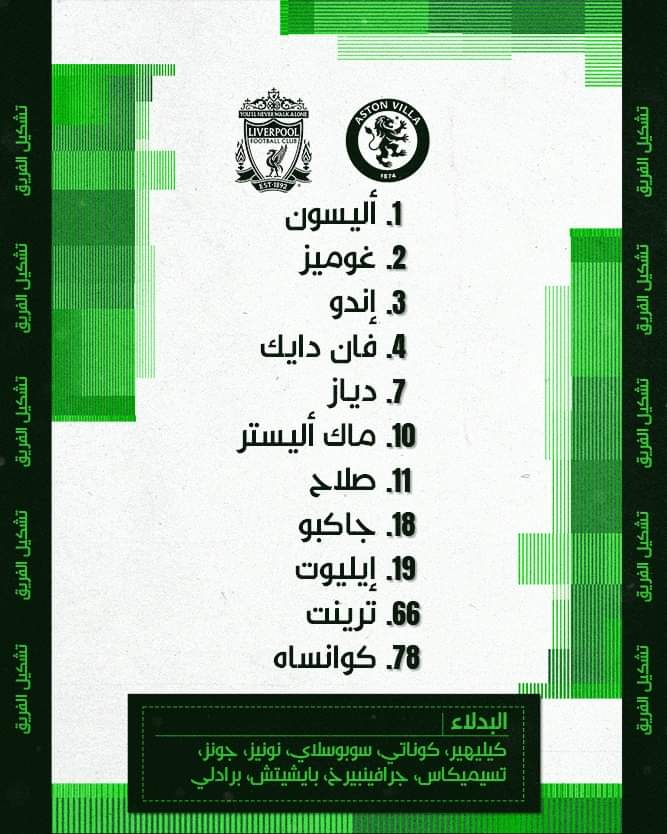أليسون – جوميز – إيندو – فان دايك – دياز – ماك أليستر – صلاح – جاكبو – إيليوت – ترينت – كوانساه.
