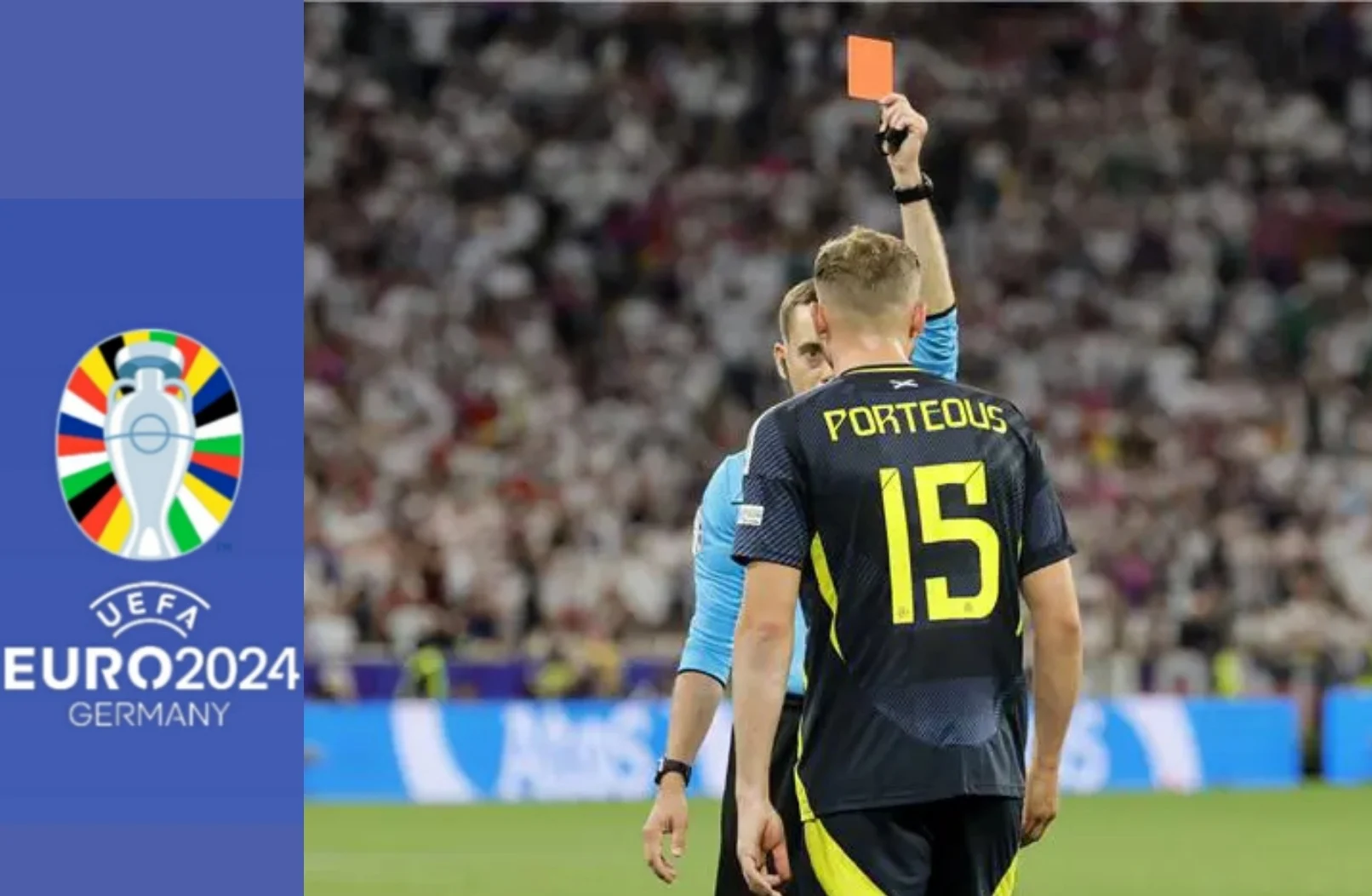 تلقى الاسكتلندي رايان بورتيوس أول بطاقة حمراء (مباشرة) في يورو 2024 بعد تدخله العنيف على مهاجم ألمانيا إلكاي جوندوجان، والتي احتسبت ضربة جزاء أيضاً سجل منها منتخب ألمانيا هدفه الثالث في الشوط الأول.