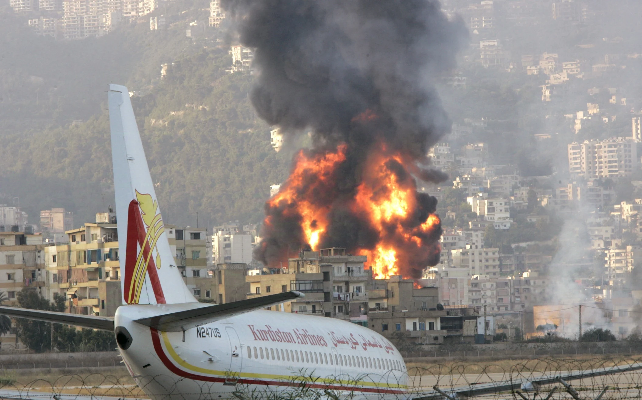 رصدت كميرات المصورين غارة اسرائيلية تستهدف أحد الأبنية السكنية المشرفة على مطار بيروت في العاصمة اللبنانية لحظة اقلاع إحدى الطائرات المدنية من المطار إلى وجهتها، يذكر أن إسرائيل تقوم بتوجيه العديد من الغارات على الضاحية الجنوبية في لبنان.