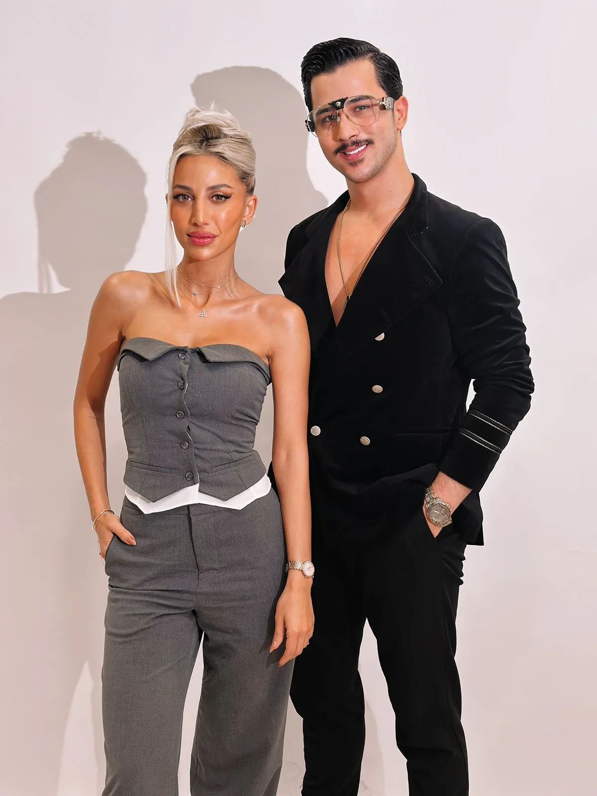 وقال محمد في البداية: “لابقين لبعض”، لترد مودل روز: “حسب القصة”، ليضيف الفنان الشاب: “قصة حب”.