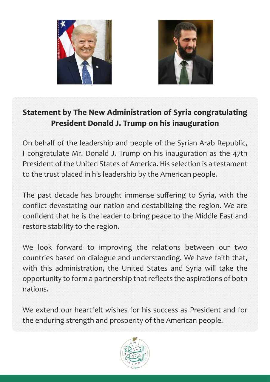 بيان من الإدارة الجديدة في سوريا تهنئ فيه الرئيس دونالد ترامب على تنصيبه